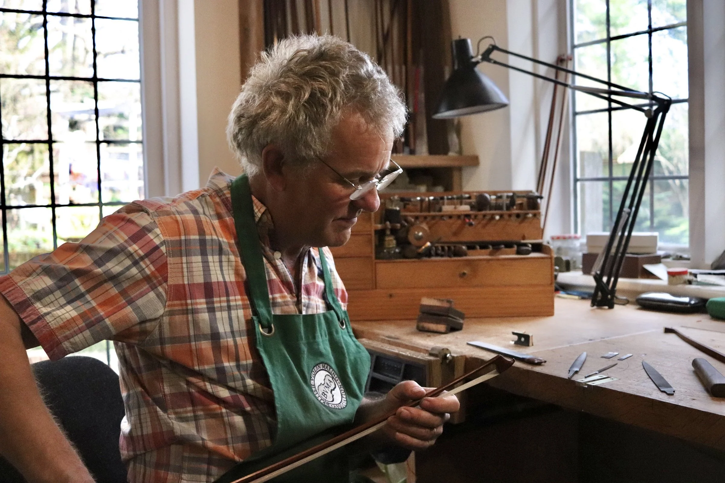 “After completing the 3 year violin making course at Newark, I joined W.E. Hill & Sons as a bow maker and repairer. Three years later I moved to J&A Beare, where I got some fantastic guidance from Charles Beare and Robert Graham. Being able to make bows alongside restoring historic bows was a great foundation for my career. I was lucky enough in my 20 years between both shops to see and work on many of the finest bows; I took particular inspiration from the great French makers François Tourte and Dominique Peccatte for my own bows.”